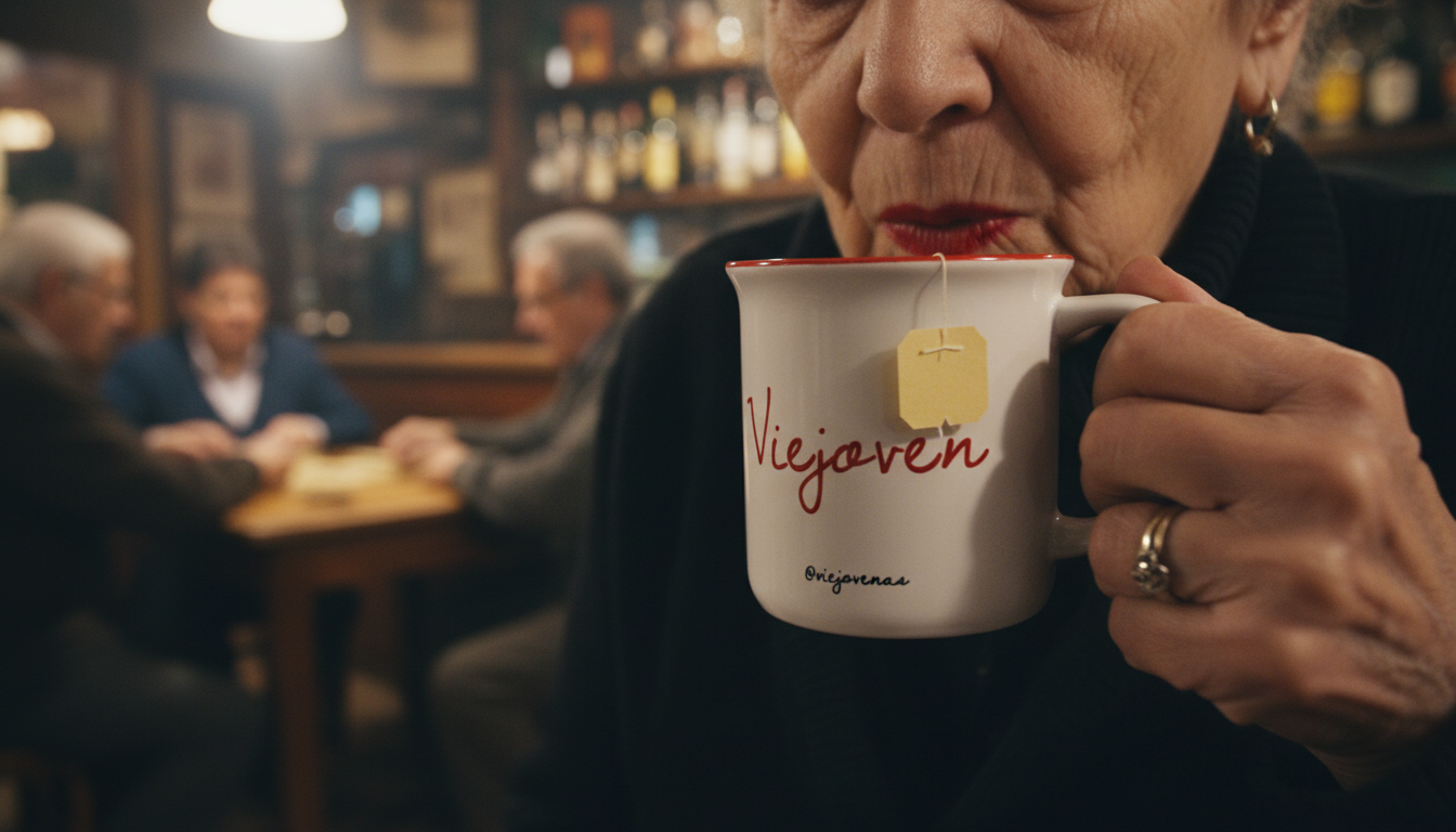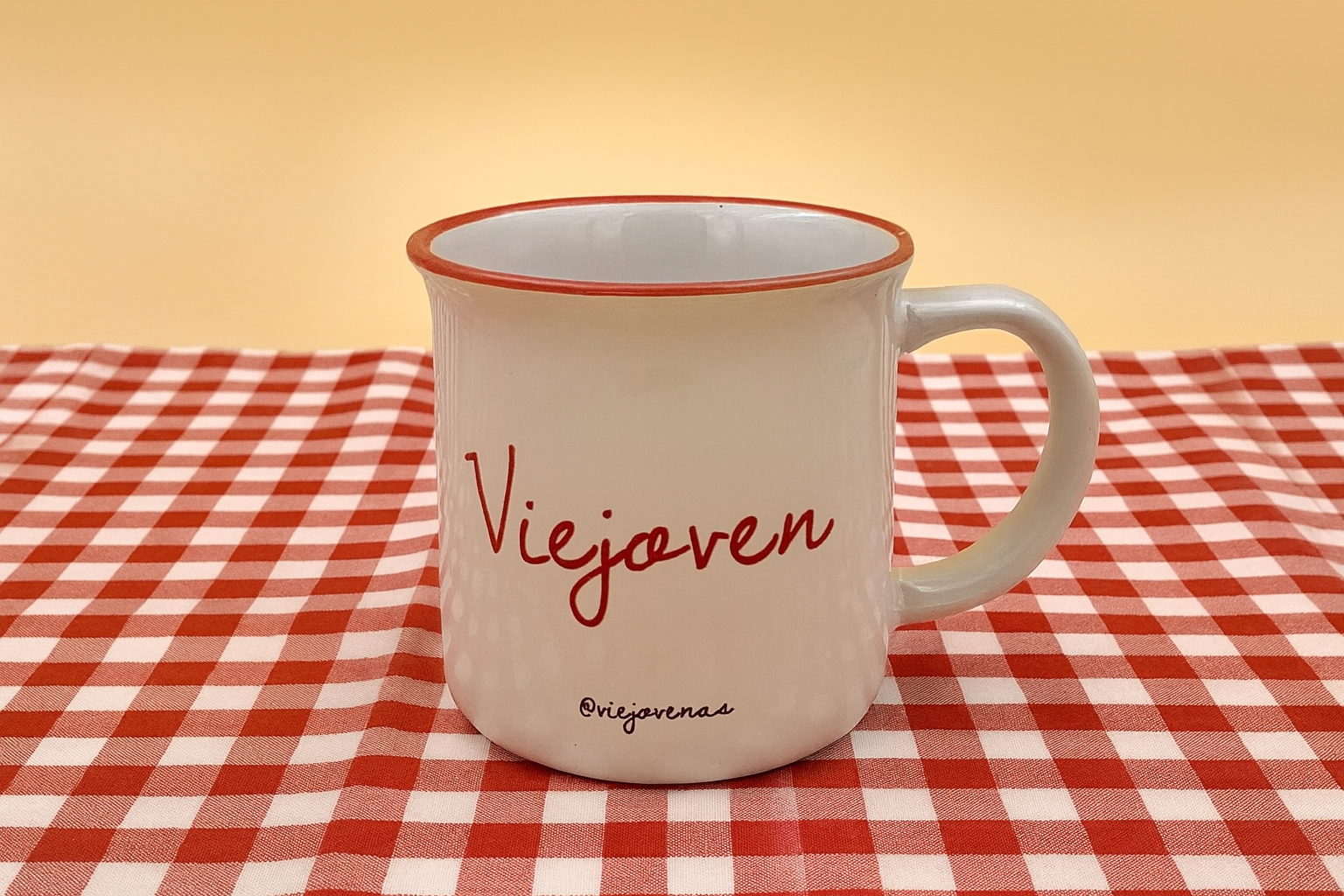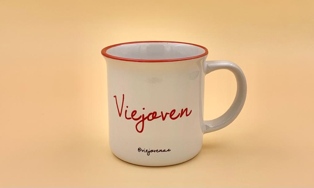 Taza de cerámica de diseño vintage con palabra «Viejoven» en color rojo